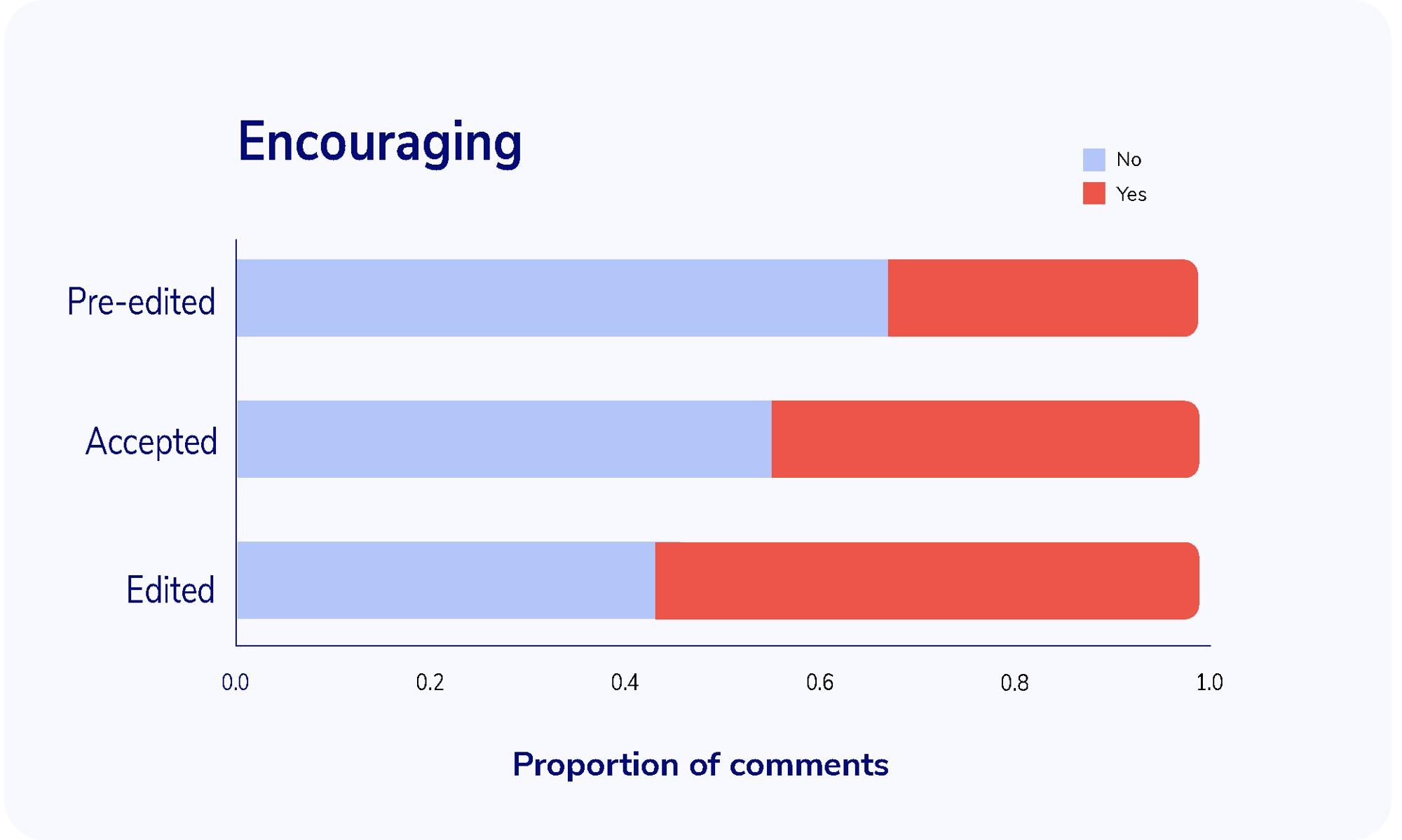 Editing AI comments increases the rate of encouraging tone by 22.3%. This surpasses the rate of encouragement in human-written comments with and without AI access. 9.7% more human-in-the-loop comments are inquiry-based than those written by human tutors without AI tool access. Human-in-the-loop feedback significantly surpasses human only (no AI access) feedback in inquiry-based comments.