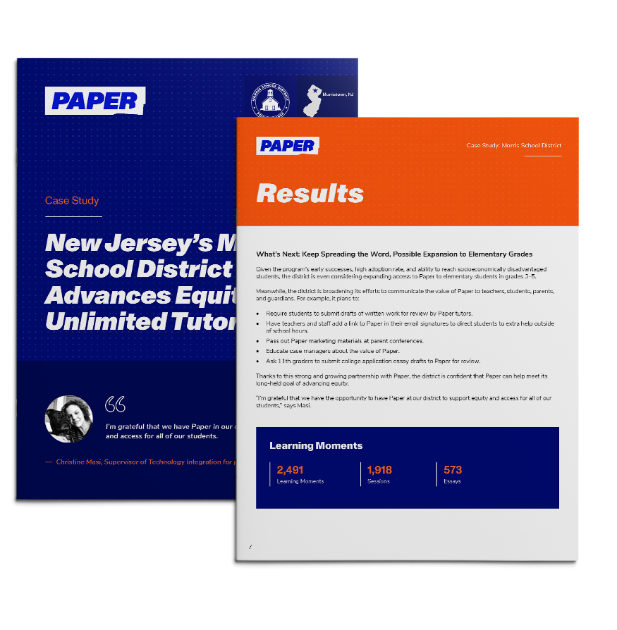 Morris SD sought a solution that would support their diverse set of learners across all subjects—including feedback on students’ writing—in a way that increased equitable access. They partnered with Paper to provide every student with expert 24x7 high dosage tutoring in multiple languages across all academic content areas.